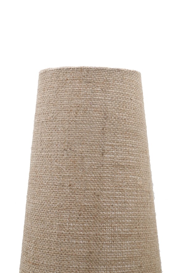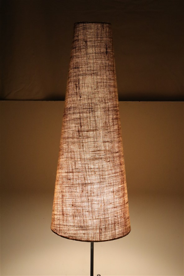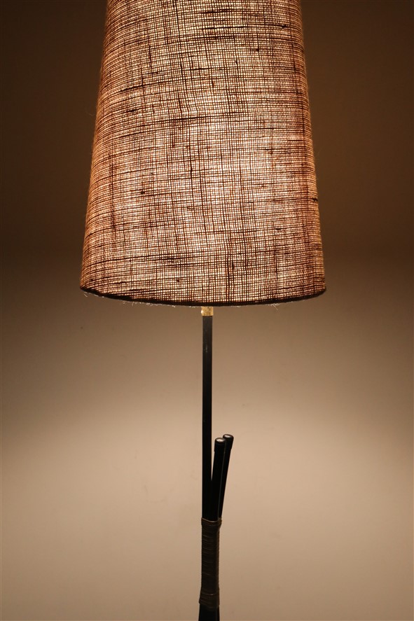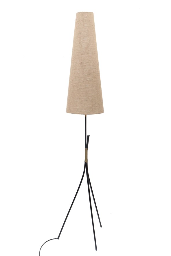 Tripod floor lamp from the 1950s-1960s. With elaborately restored lampshade. Newly covered with jute. Black rubberized steel stand with brass parts. Approx. 169 cm high with shade. Used item. According to age only slight signs of use. See photos. These are part of the description. Colors may vary as each device/display shows colors differently. Jute is a natural fiber. This has a natural jute smell as long as it is freshly processed, which weakens with time. Shipping will be in two packages.