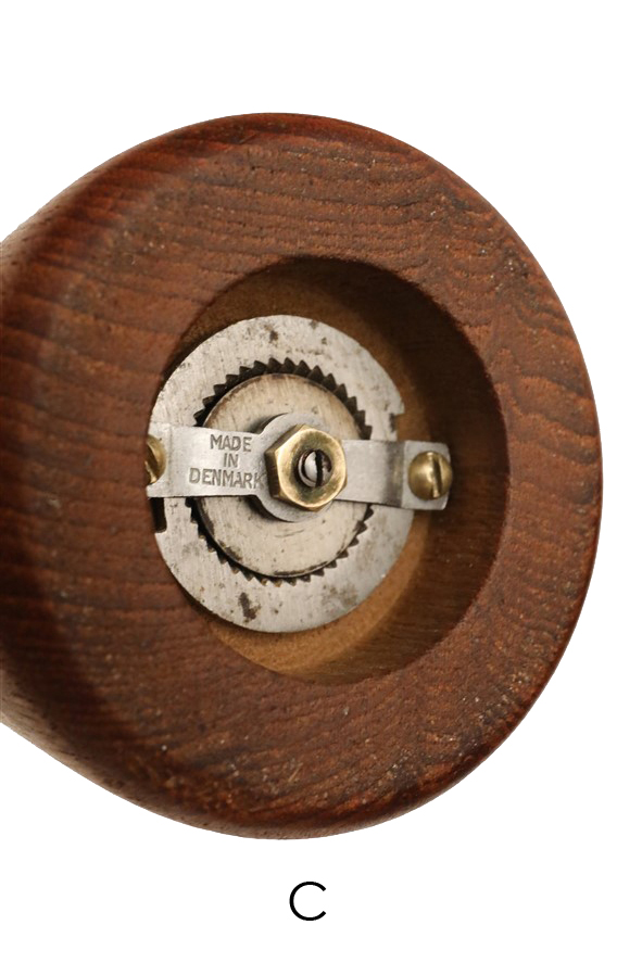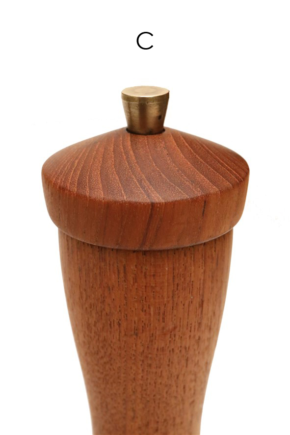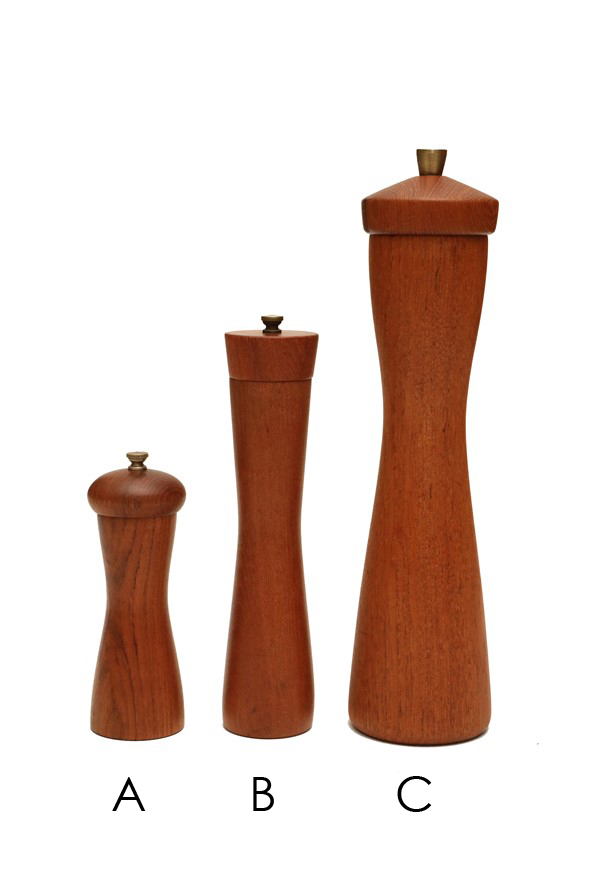 1950s-1960s, Denmark, solid teak, steel, brass. Version A: 14cm, version B: 21cm, version C: 29cm. Used item. According to age only slight signs of use. See photos, which are part of the description. These are the original pictures of the items for sale. Anyway: Colours may vary slightly as they are displayed differently on different devices / screens.