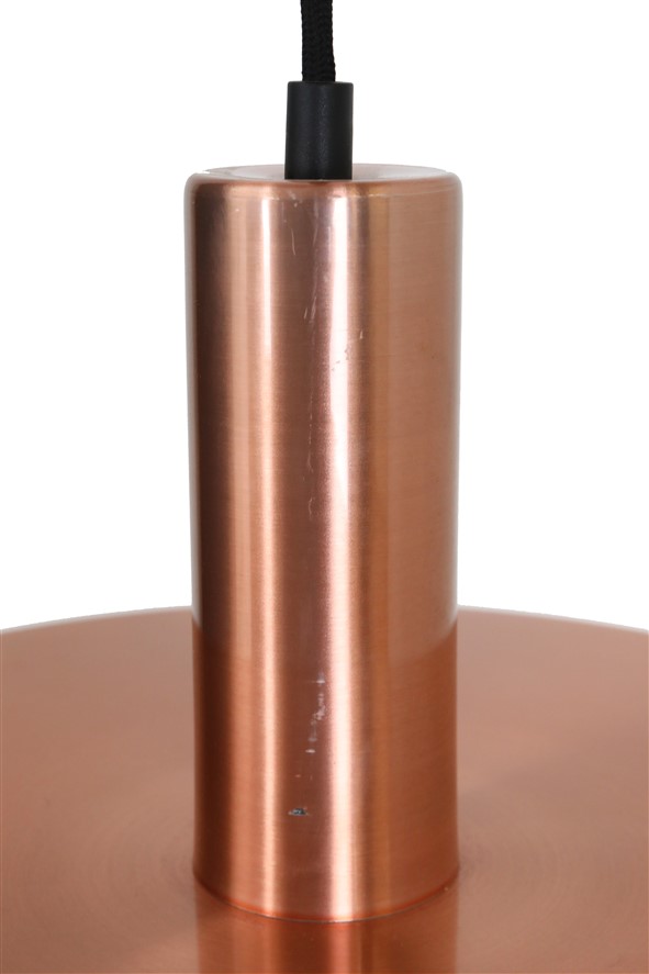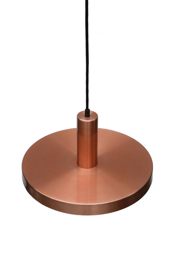 1960er-1970er Jahre, Dämemark. Kupferfarben eloxiertes Aluminium. Durchmesser ca. 35cm. Lieferung mit hochwertigem Textilkabel (ca. 2,40m), Glühbirne und Baldachin. Gebrauchtware. Altersgemäß wenige Gebrauchsspuren. Siehe Fotos. Diese sind Bestandteil der Beschreibung. Dies sind die Originalbilder der zum Verkauf stehenden Artikel. Trotzdem können die Farben leicht variieren, da sie auf verschiedenen Geräten / Bildschirmen unterschiedlich dargestellt werden.