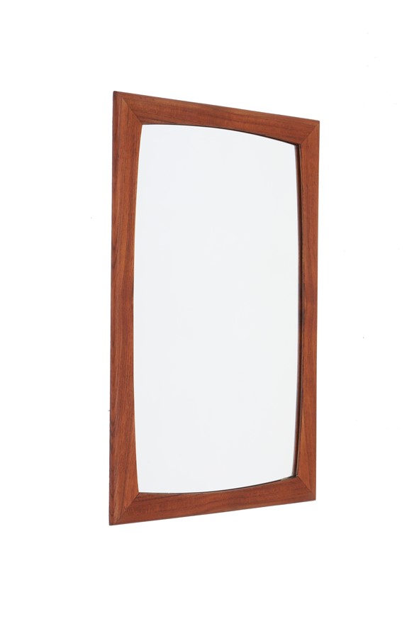 1950er-1960er Jahre, Dänemark. Wandspiegel mit Rahmen aus massivem Teakholz. Kein Furnier. Ca. 52 x 33cm. Gebrauchtware. Altersgemäß wenige Gebrauchsspuren. Siehe Fotos. Diese sind Bestandteil der Beschreibung. Die Farben können variieren, da jedes Gerät/Display die Farben anders darstellt.